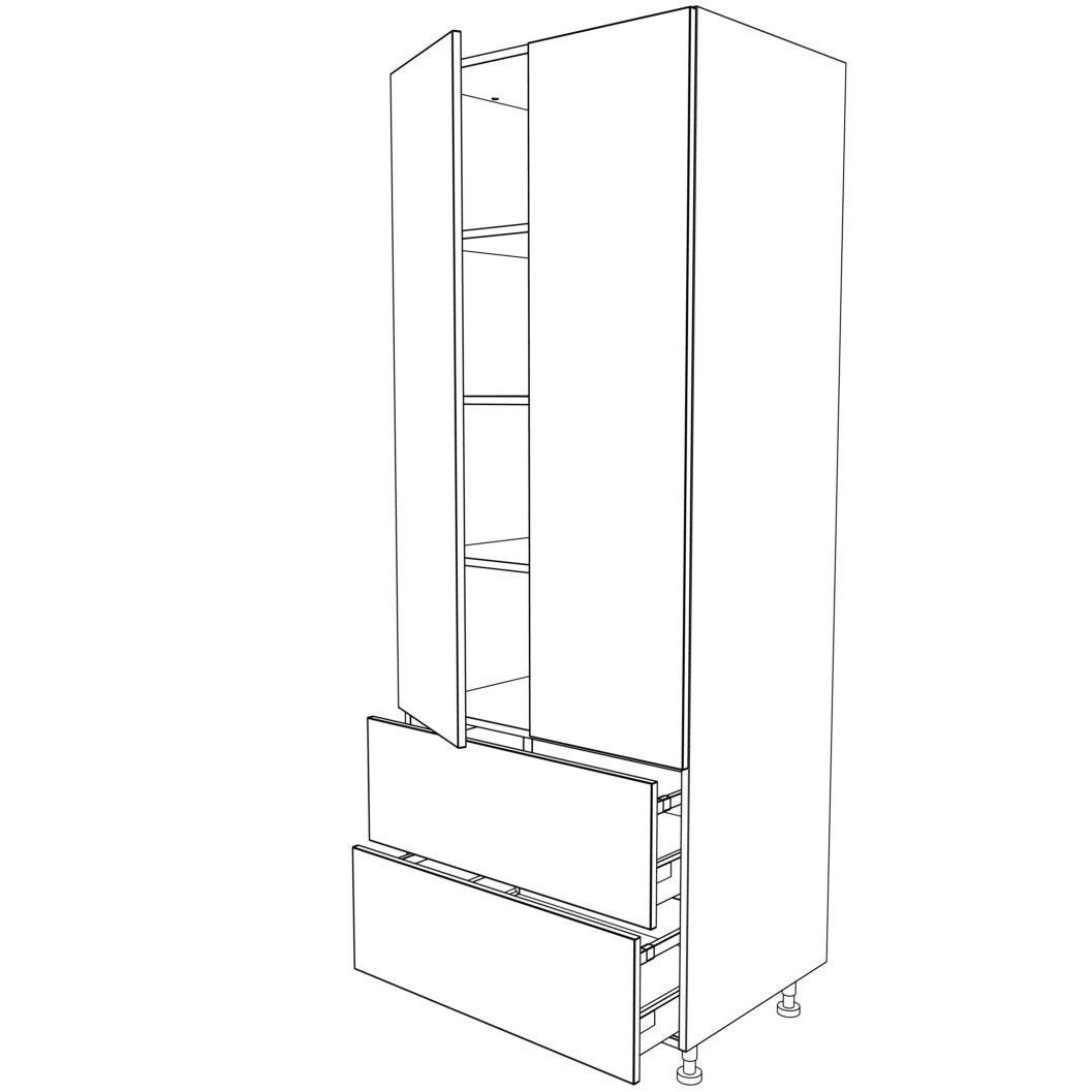 Multifunkcjonalna szafka z dwoma frontami i dwoma szufladami HS2D2 z płyty EGGER 18 mm. Stała przegroda na 570mm optymalizuje przestrzeń. Głębokość szuflad zależy od głębokości szafki. Wykonana z odpornej płyty laminowanej EGGER 18mm. Obrzeże ABS i klej odporny na wilgoć zapewnia trwałość. Białe plecy HDF (3mm), cofnięte o 20mm, gwarantują stabilność i dopasowanie nawet do nierównej powierzchni. Solidne nóżki Häfele z regulacją wysokości wytrzymują do 150 kg każda. Szybki montaż bez klejenia - system Quickfit z mimośrodami TITUS. Możliwość wyboru kolorystyki to idealne uzupełnienie każdych wnętrz.