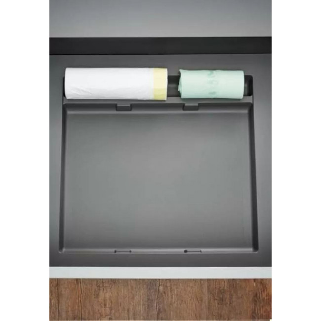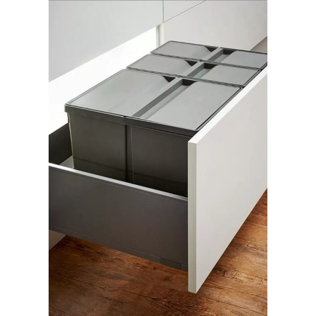 Sortownik do segregacji śmieci Pullboy Vario 9XL pokazany na zdjęciach wraz z szufladą jest tylko propozycją aranżacji i jako całkowity zestaw nie stanowi oferty sprzedażowej. Szufladę należy wykonać w własnym zakresie.