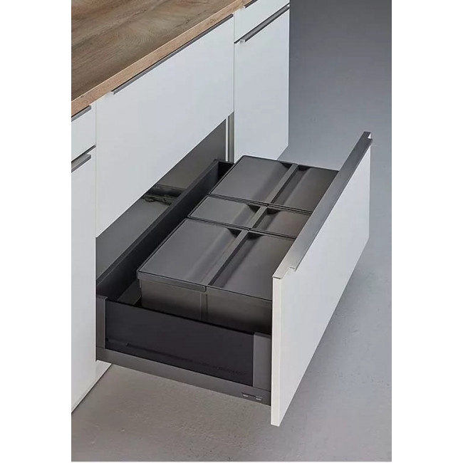 Sortownik do segregacji śmieci Pullboy Vario 9XL pokazany na zdjęciach wraz z szufladą jest tylko propozycją aranżacji i jako całkowity zestaw nie stanowi oferty sprzedażowej. Szufladę należy wykonać w własnym zakresie.