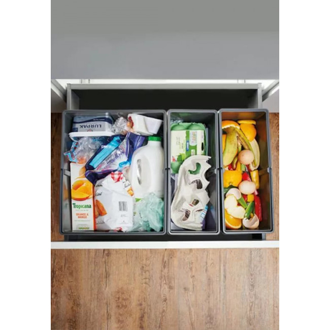 Sortownik do segregacji śmieci Pullboy Vario 9XL - 800 mm, to bardzo praktyczny zestaw trzech pojemników wstawianych bezpośrednio do szuflady, zapewniając możliwość recyklingu. Sortownik na śmieci przeznaczony jest do szuflady o zewnętrznej szerokości 80 cm i głębokości 50 cm. Minimalna wysokość wewnętrzna jaka jest potrzebna to 300 mm. Zestaw pasuje do szuflady montowanej pod zlewozmywak.