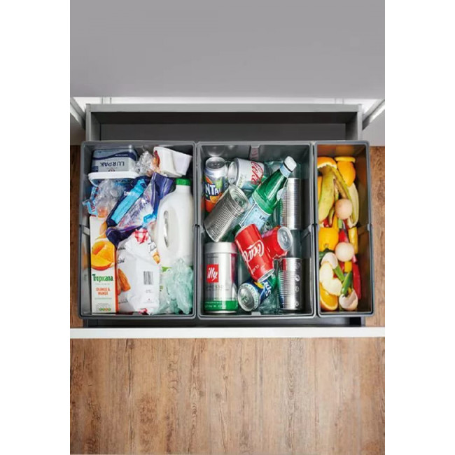Sortownik do segregacji śmieci Pullboy Vario 9XL - 900 mm, to bardzo praktyczny zestaw trzech pojemników wstawianych bezpośrednio do szuflady. Sortownik na śmieci przeznaczony jest do szuflady o zewnętrznej szerokości 90 cm i głębokości 50 cm. Minimalna wysokość wewnętrzna jaka jest potrzebna to 300 mm. Zestaw pasuje do szuflady montowanej pod zlewozmywak.