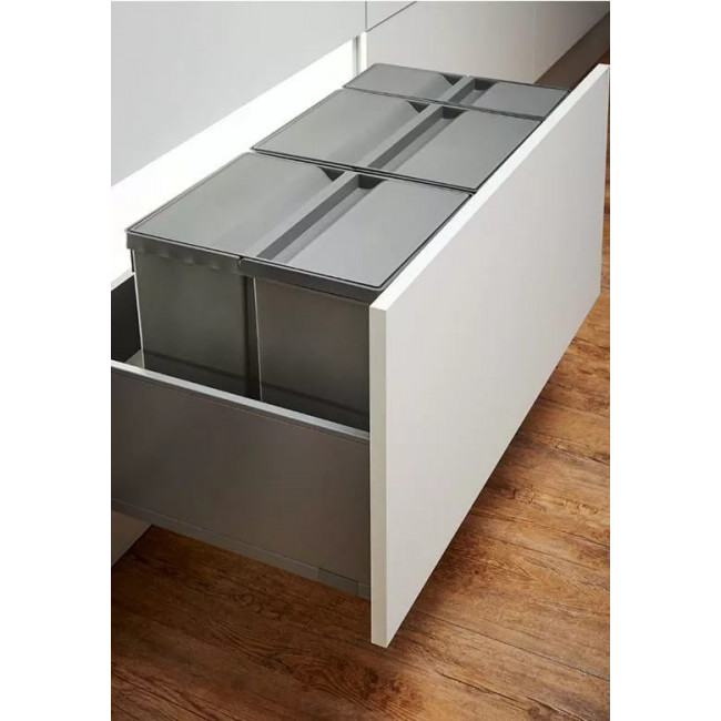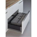 Sortownik do segregacji śmieci Pullboy Vario 9XL pokazany na zdjęciach wraz z szufladą jest tylko propozycją aranżacji i jako całkowity zestaw nie stanowi oferty sprzedażowej. Szufladę należy wykonać w własnym zakresie.