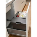 Polecamy zestaw dwóch pojemników na śmieci (40 l +17 l) do typowej szuflady Antaro o szerokości frontu 60 cm i standardowej głębokości prowadnicy 50 cm. Minimalna wysokość wewnętrzna jaka jest potrzebna to 38 cm lub 40 cm przy zwiększonej pojemności do 43 l (przestrzeń mierzona od dna szuflady do górnego pierścienia). Zestaw pasuje do szuflady montowanej pod zlewozmywak, ponieważ głębokość jaką zajmuje to tylko 34,5 cm (wymiar bez wytłoczki).