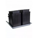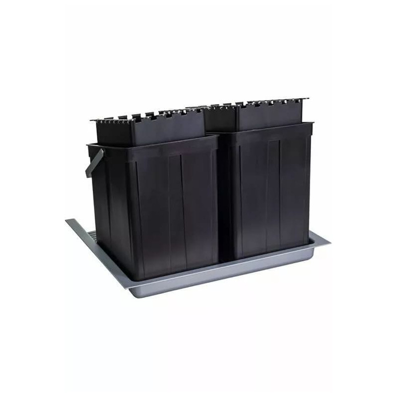 Basic Plus – zestaw pojemników 600/ 2x26 l w kolorze antracytowym, z plastikową podstawką w kolorze szarym. Zestaw koszy na śmieci pasuje do szuflady z frontem o szerokości 600 mm. Minimalna wysokość wewnętrzna jaka jest potrzebna to około 420 mm (przestrzeń mierzona od dna szuflady wraz z zamontowaną pokrywą). Kosze będą pasować w szufladzie, która mieści się pod zlewozmywakiem.