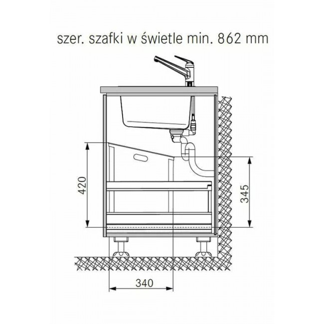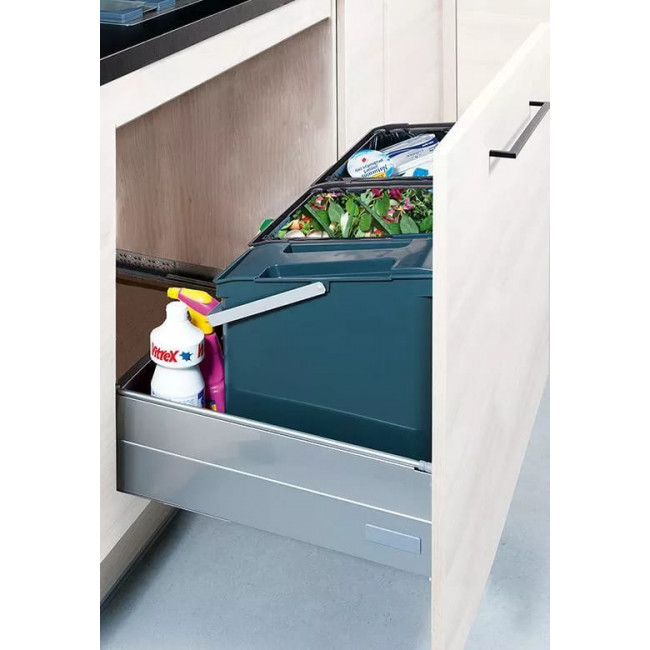 Basic – zestaw pojemników 900/ wys. 420/ 2x35+20 z 1 pokrywką. Pojemniki pasują do szuflady o szerokości frontu 900 mm. Minimalna wysokość wewnętrzna jaka jest potrzebna to tylko około 430 mm (przestrzeń mierzona od dna szuflady do wysokości pojemnika). Pojemniki będą pasować do szuflady montowanej pod zlewozmywakiem.