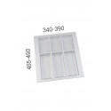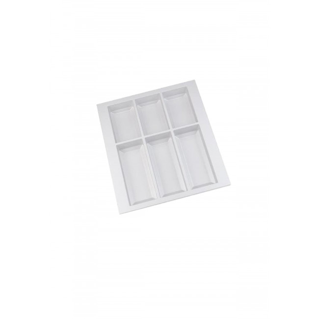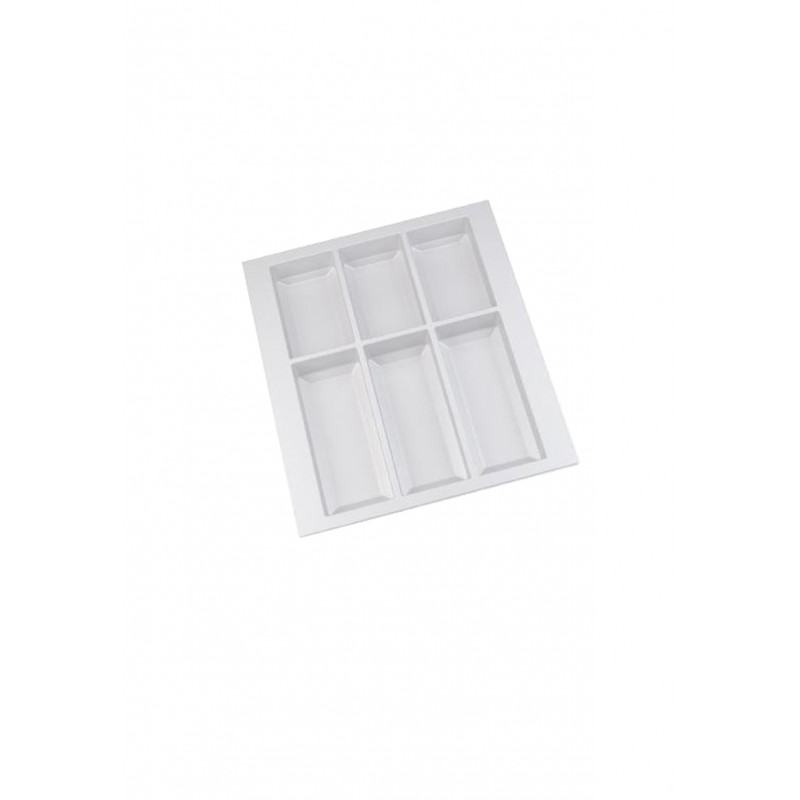 Wkład Classico na sztućce i akcesoria kuchenne w kolorze białym. Wkład pasuje do szuflad o szerokości frontu 450 mm i głębokości prowadnicy 500 mm. Wkład ma po szerokości i po długości szerszy zapas, który umożliwia samodzielne docięcie wkładu do niestandardowych wymiarów szafki z szufladami.