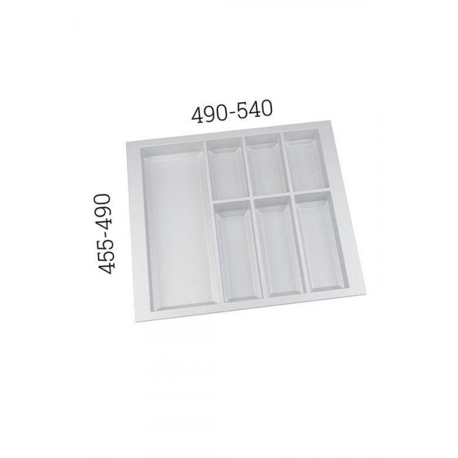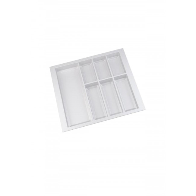 Wkład Classico na sztućce i akcesoria kuchenne w kolorze białym. Wkład pasuje do szuflad o szerokości frontu 600 mm i głębokości prowadnicy 500 mm. Wkład ma po szerokości i po długości szerszy zapas, który umożliwia samodzielne docięcie wkładu do niestandardowych wymiarów szafki z szufladami.