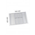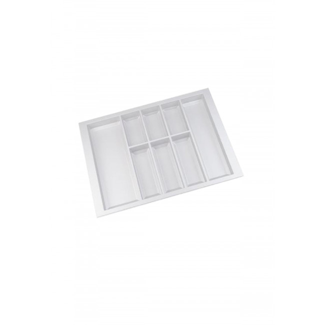 Wkład Classico na sztućce i akcesoria kuchenne w kolorze białym. Wkład pasuje do szuflad o szerokości frontu 700 mm i głębokości prowadnicy 500 mm. Wkład ma po szerokości i po długości szerszy zapas, który umożliwia samodzielne docięcie wkładu do niestandardowych wymiarów szafki z szufladami.