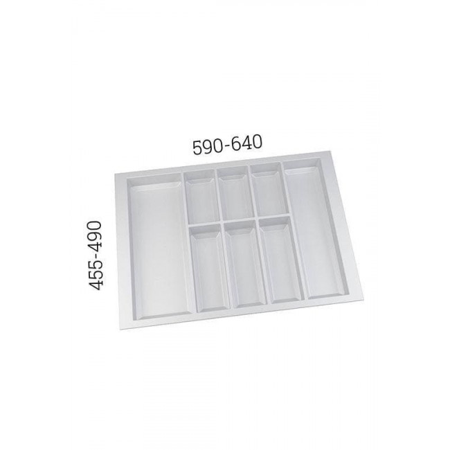 Przy podanej szerokości do dyspozycji mamy 8 komór. Trzy mniejsze komory posłużą do przechowywania łyżeczek, widelczyków czy innych drobnych akcesoriów np.: zaparzacza do herbaty, trzy większe komory świetnie zorganizują przestrzeń na łyżki stołowe, noże i widelce.