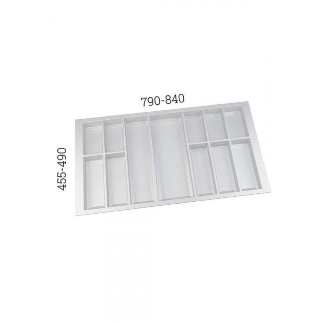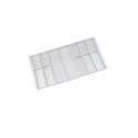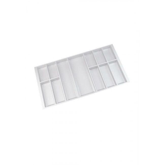 Wkład Classico na sztućce i akcesoria kuchenne w kolorze białym. Wkład pasuje do szuflad o szerokości frontu 900 mm i głębokości prowadnicy 500 mm. Wkład ma po szerokości i po długości szerszy zapas, który umożliwia samodzielne docięcie wkładu do niestandardowych wymiarów szafki z szufladami.