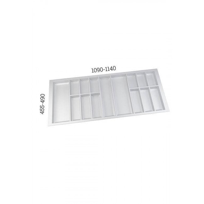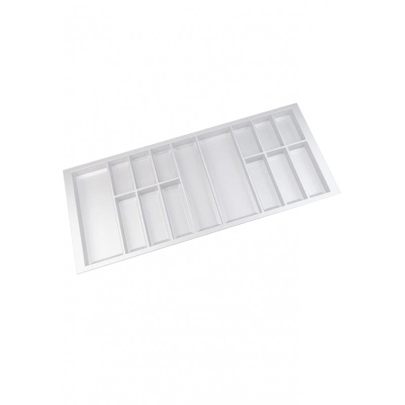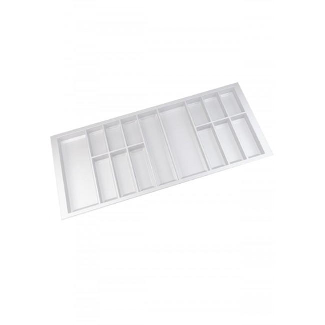 Wkład Classico na sztućce i akcesoria kuchenne w kolorze białym. Wkład pasuje do szuflad o szerokości frontu 1200 mm i głębokości prowadnicy 500 mm. Wkład ma po szerokości i po długości szerszy zapas, który umożliwia samodzielne docięcie wkładu do niestandardowych wymiarów szafki z szufladami.