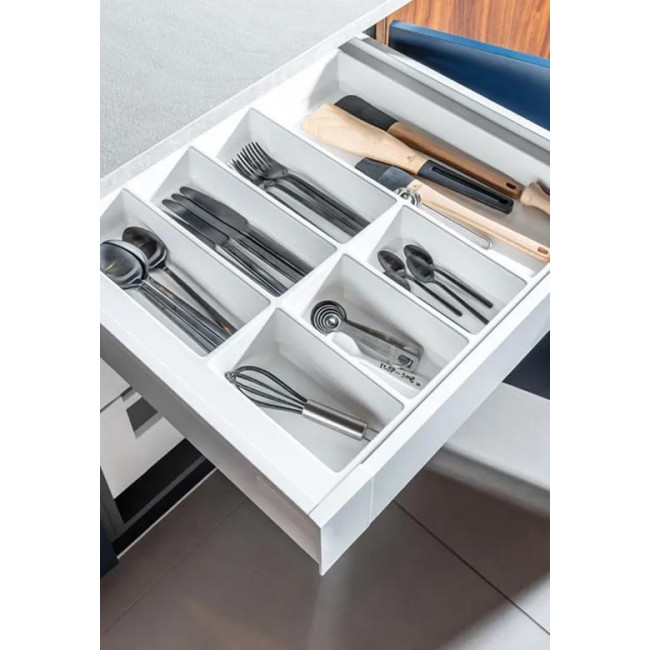 Wkład Classico na sztućce i akcesoria kuchenne w kolorze białym. Wkład pasuje do szuflad o szerokości frontu 600 mm i głębokości prowadnicy 500 mm.
