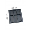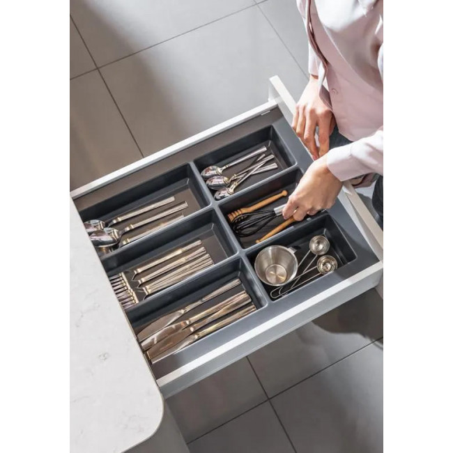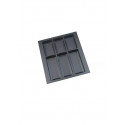 Wkład Classico na sztućce i akcesoria kuchenne w kolorze antracytowym. Wkład pasuje do szuflad o szerokości frontu 450 mm i głębokości prowadnicy 500 mm. Wkład ma po szerokości i po długości szerszy zapas, który umożliwia samodzielne docięcie wkładu do niestandardowych wymiarów szafki z szufladami.