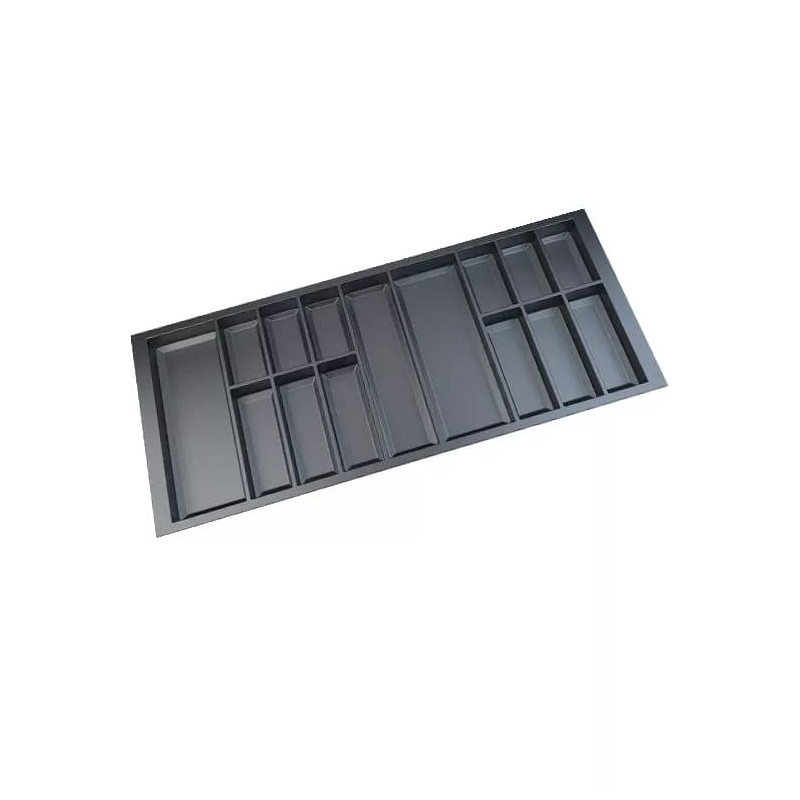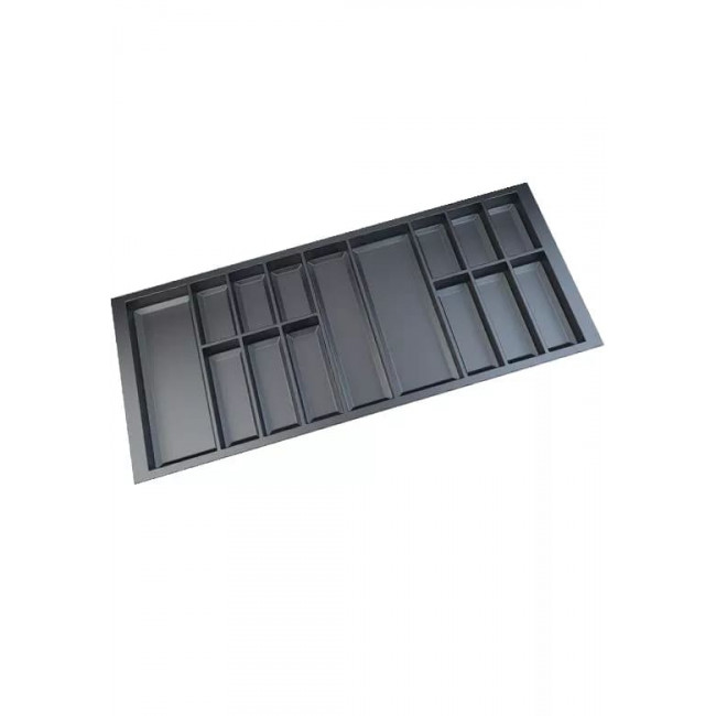 Wkład Classico na sztućce i akcesoria kuchenne w kolorze antracytowym. Wkład pasuje do szuflad o szerokości frontu 1200 mm i głębokości prowadnicy 500 mm. Wkład ma po szerokości i po długości szerszy zapas, który umożliwia samodzielne docięcie wkładu do niestandardowych wymiarów szafki z szufladami.